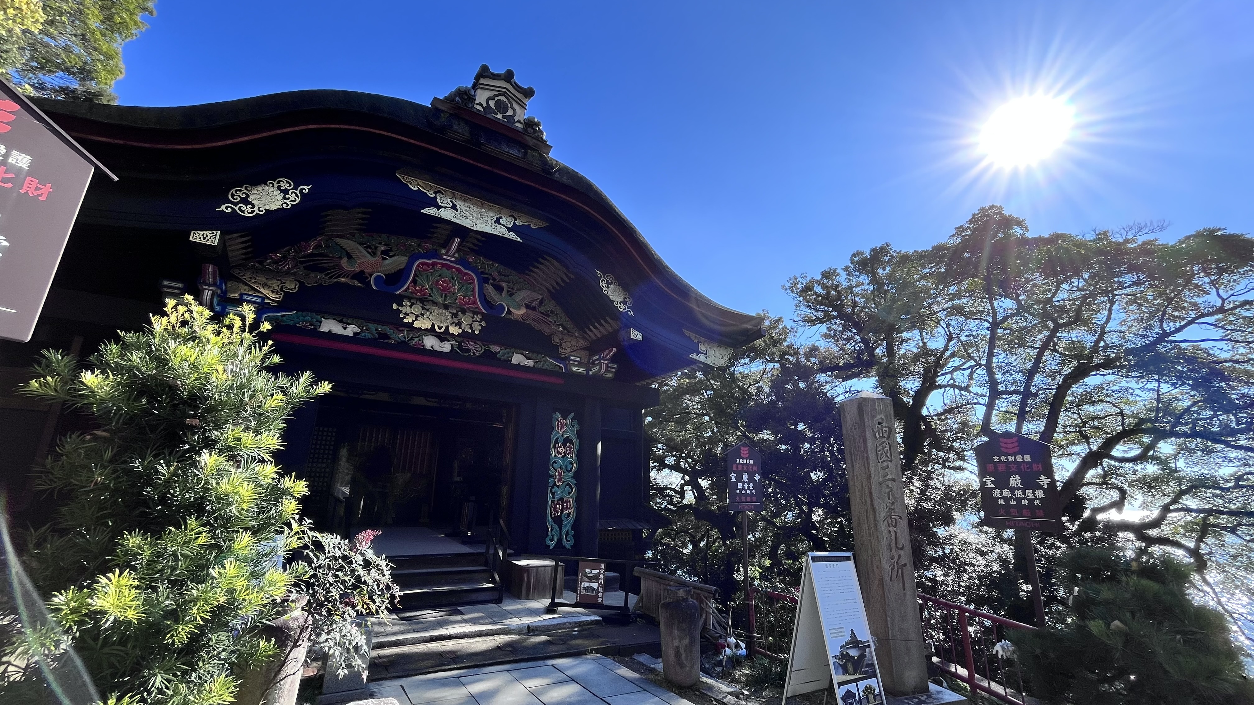 <宝厳寺・本堂> 西国観音霊場第三十番札所の宝厳寺の本堂には日本三弁財天の大弁財天がご本尊として祀られています。こちらでは紙に書いた願い事をだるまに入れる「幸せ願いダルマ」が奉納できます。 <三重塔> 三重塔は江戸時代初期に落雷によって焼失したと言われており、2000年に約350年ぶりに復元。古来の工法に基づいて建築され、6年の歳月をかけて現在の姿が完成しました。お釈迦さまの遺骨を納めた仏舎利塔をかたどっています。 <宝厳寺 国宝「唐門」・重文「観音堂」> 国宝に指定されている唐門は豪華絢爛な桃山様式の唐門の代表的な遺構であると言われています。鳳凰や兎、松や牡丹などの美しい彫刻や天井には鮮やかな文様が今も残されています。唐門内部には鎌倉時代に作られた千手観世音菩薩を納めた観音堂があります。千手観音像は秘仏とされ、開扉は原則60年に一度で普段は開扉していません。 2013年度より実施されていた、『唐門』『観音堂』『舟廊下(渡廊)』の檜皮屋根の全面葺き替え、彩色・漆塗りの塗り直し、 及び飾り金具の鍍金メッキ仕上げ等の修復保存事業は2020年春に完了し、美しい姿になりました。 <都久夫須麻神社(竹生島神社)> 宝厳寺と同じく弁財天に加え、龍神と産土神の三柱を祭神としています。本殿の先には龍神拝所があり、2枚で1組の素焼きの皿に願い事を書き、湖を望む鳥居に向かってかわらけを投げる願掛けができます。