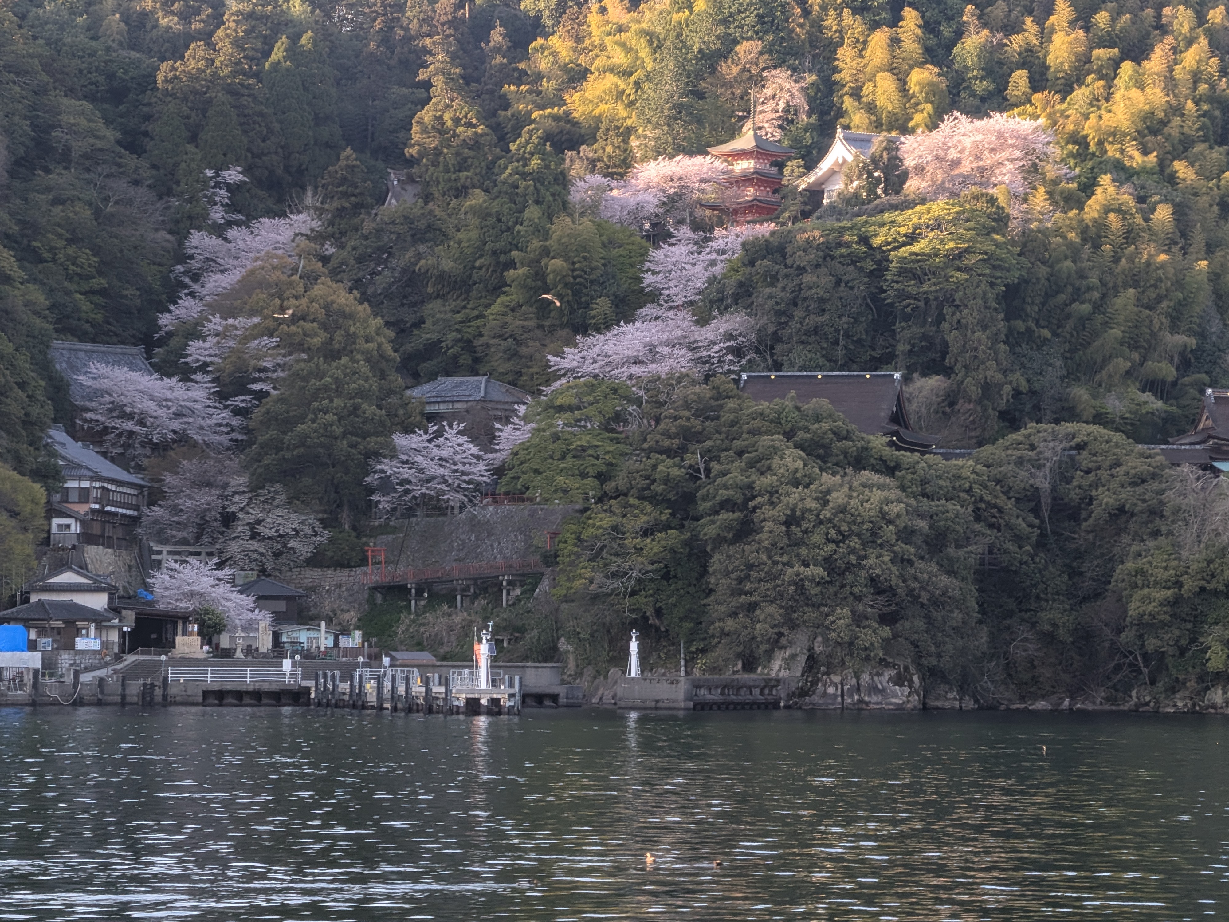 海津大崎港へ着船。約30分の散策をお楽しみいただけます。 港の近くには、地元の方々に「大崎観音」の名で親しまれている「大崎寺」があります。 桜とともにお楽しみください。